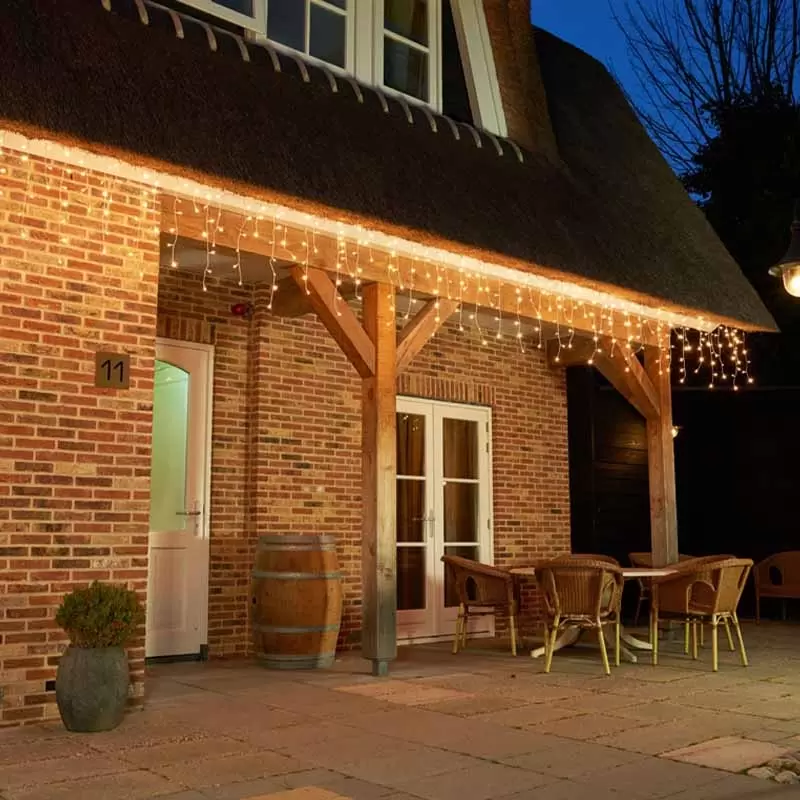 Een blikvanger langs een dakrand of raam. 7,2 meter snoer met 360 warmwitte LED lampjes en 5 meter aanloopsnoer. Incl. trafo en timerfunctie. Geschikt voor binnen en buiten.