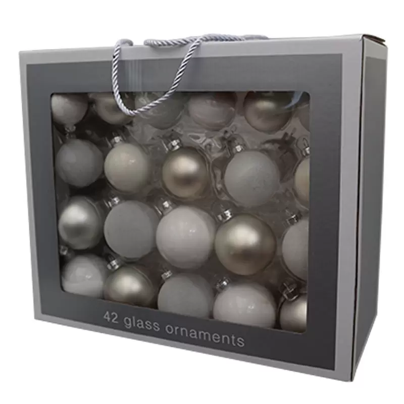 Mixdoos van 42 glazen kerstballen met glanzende, matte en glitter finish in verschillende maten.