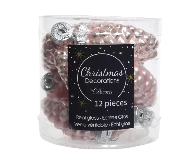 Dennenappel glas emaille-mat 12 stuks a 6 cm. Poederroze