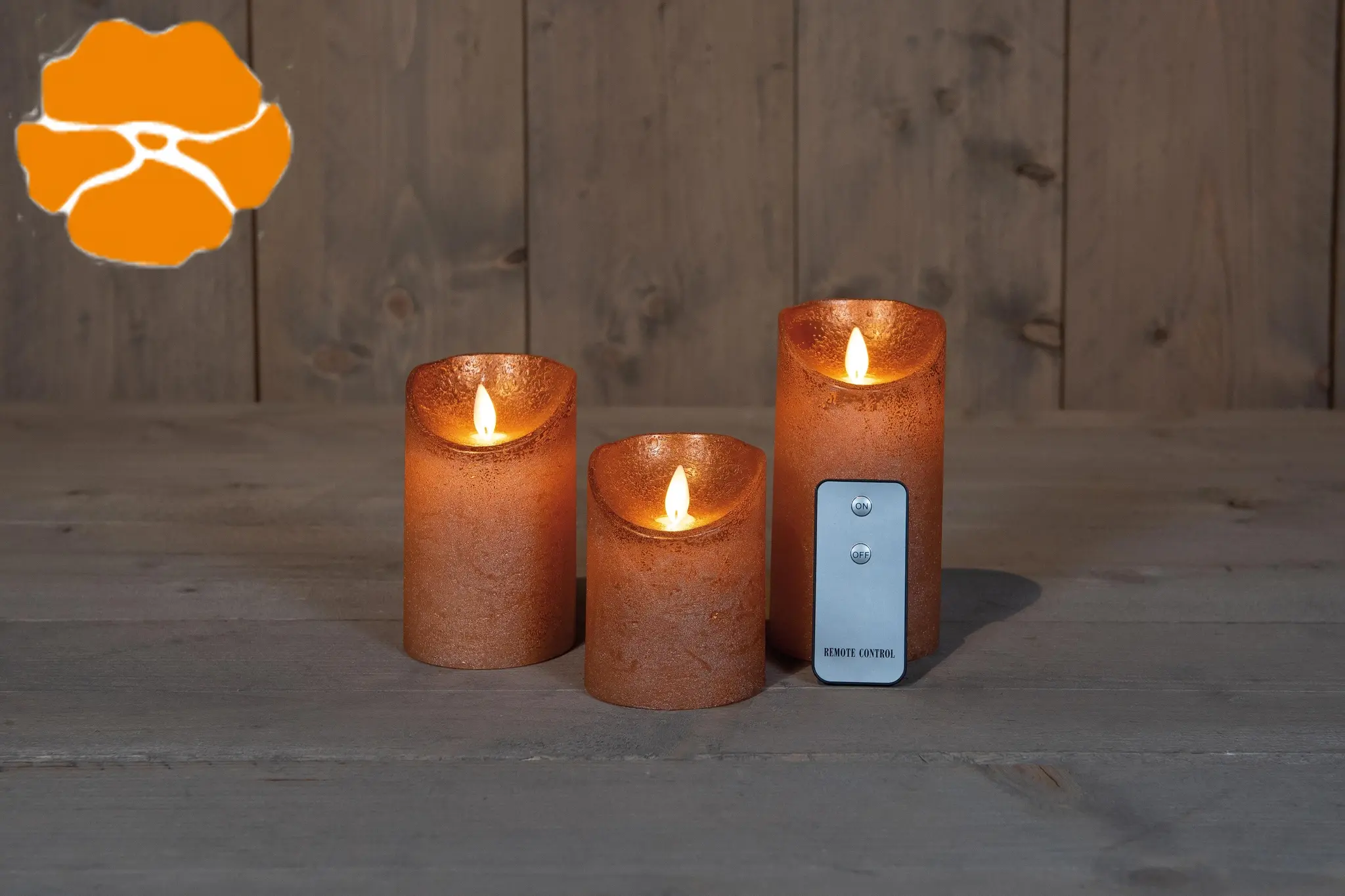 3ST KAARS KOPER WAX RUSTIEK BEWEGENDE VLAM 7,5X10/12,5/15CM - 3X3AAA INCL. AFSTANDSBEDIENING