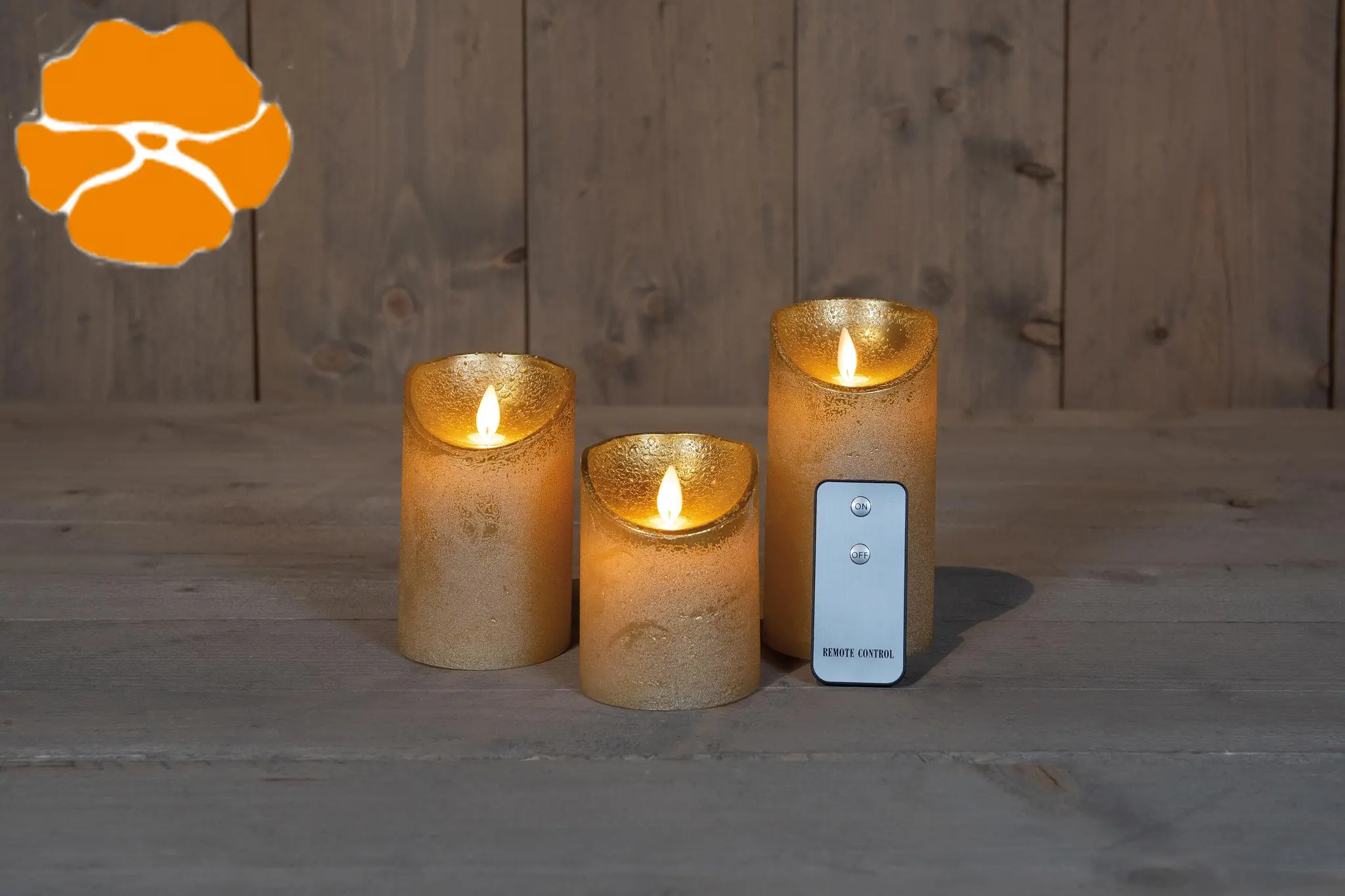 3ST KAARS GOUD WAX RUSTIEK BEWEGENDE VLAM 7,5X10/12,5/15CM - 3X3AAA INCL. AFSTANDSBEDIENING