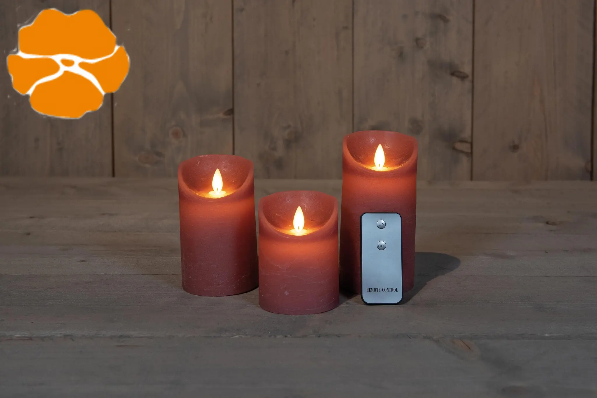 3ST KAARS ANTIEK ROZE WAX RUSTIEK BEWEGENDE VLAM 7,5X10/12,5/15CM - 3X3AAA INCL. AFSTANDSBEDIENING