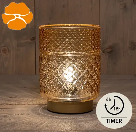 GLAZEN LAMP AMBER MET GOUDEN VOET 12X17,5CM 2XAAA ON/OFF/6U TIMER