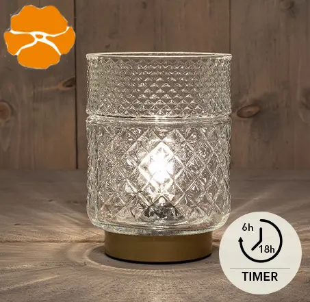 GLAZEN LAMP HELDER MET GOUDEN VOET 12X17,5CM 2XAAA ON/OFF/6U TIMER