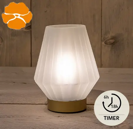 GLAZEN LAMP MAT WIT MET GOUDEN VOET 12X17CM 2XAAA ON/OFF/6U TIMER