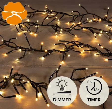 1,9-2,2M TREECLUSTER 12,5M/960LED WARM WIT / CLASSIC - 4M AANLOOPSNOER ZWART -BI-BUI- / IP44 TRAFO AAN / 8/16U TIMER / UIT / DIMMER