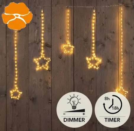 STER-GORDIJN DRAAD TRANSPARANT 186L/90X80CM LED CLASSIC WARM 5 STRENGEN/STERREN - 5M AANLOOPSNOER - IP44 TRAFO AAN / 8/16U TIMER / UIT / DIMMER
